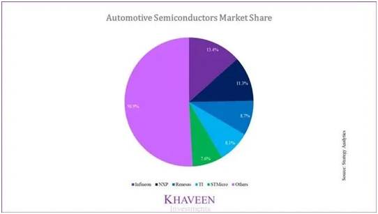但是,我們認為,由于其歐洲本土競爭對手(憑借領先的高端汽車制造商品牌的強大網絡作為合作伙伴)在本國市場的優勢,因此后者在這一細分市場中的地位更高。英飛凌,恩智浦等歐洲供應商的市場領先地位證明了這一點。數據顯示,意法半導體占該市場份額的32.8%,而德州儀器(TI)則為8.1%。