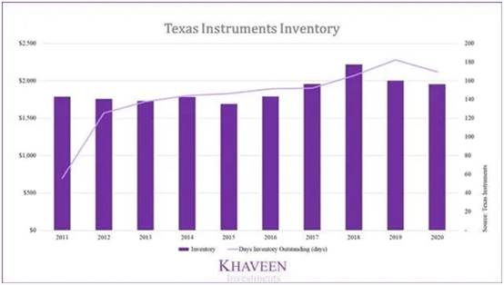 該公司的庫存水平在過去幾年中有所增長,未清庫存天數增加了169天,而2015年為146天。其2020年庫存占收入的百分比為13.5%,高于類似品牌的競爭對手設備占收入的百分比為9%,恩智浦為12%。因此,這為公司提供了堅實的地位,可以利用緊張的供應環境,高庫存水平和對供應鏈的更好控制。