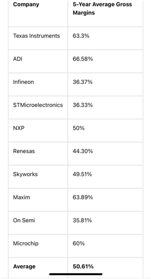 此外,該公司對內部制造的關注以及對300mm晶圓的關注都是引致他們獲得高毛利率的原因。在其競爭對手中,德州儀器(TI)的5年平均毛利潤率僅次于Analog Devices和Maxim,位居第三,但遠高于行業平均水平50.61%。