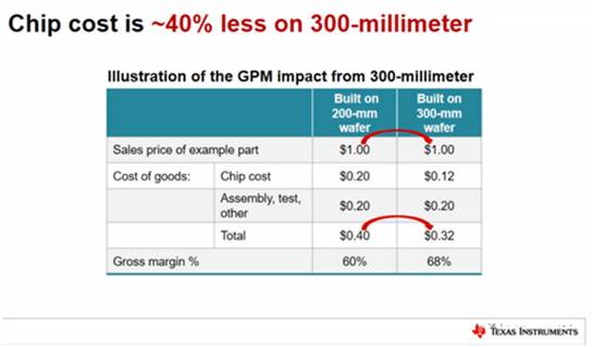 但是,由于其300mm生產的擴大,該公司的毛利率在未來幾年可能會更高。該公司一直致力于通過投資300毫米生產來創造具有競爭力的制造成本優勢。管理層表示,在封裝之前,基于300mm晶圓的芯片的成本比200mm晶圓便宜40%。2020年,該公司宣布在得克薩斯州的Richardson建造晶圓制造廠,從而彰顯了其擴大300mm制造規模的承諾。該設施的預算總成本為8.5億美元,預計到2024年將全部完成,每年從該設施中帶來50億美元的額外收入。