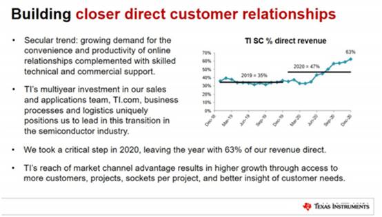 到2020年底,其直銷渠道的銷售百分比已大幅增長至63%,幾乎占收入的三分之二,回到2019年,這個數字為35%。通過與最大客戶的緊密聯系,我們看到了潛在的優勢使其有更多設計項目的機會,并有機會增加對這些客戶的產品銷售。