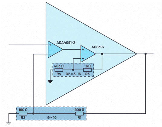 通過將兩個放大器串聯在一起,可以將兩者的出色特性相結合,從而獲得使用單個運算放大器無法實現的結果。例如,可以實現具有高輸出功率和高帶寬的高精度放大器。圖1所示的示例電路使用了軌到軌放大器AD8397(–3 dB帶寬 = 69 MHz)和精密放大器ADA4091-2(–3 dB帶寬 = 1.2 MHz),將兩者組合得到的帶寬比單個放大器(放大器1)的帶寬要高2倍以上(G = 10)。此外,將AD8397和各種精密放大器組合,還可以降低噪聲,并改善THD特性。但是,在設計中,還必須通過修正放大器配置來確保系統的穩定性。如果考慮所有標準,復合放大器也可能適用于各種要求嚴苛的廣泛應用。 |