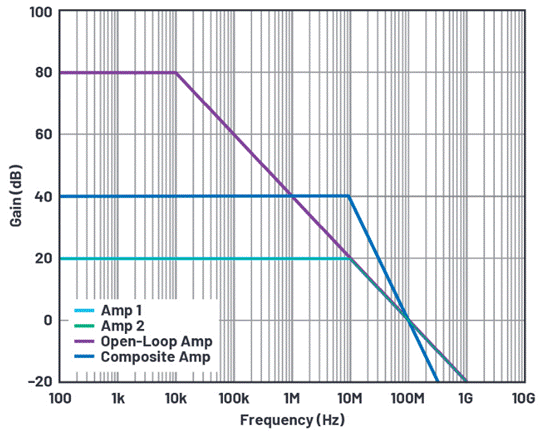 這種說明相對簡單。增益均勻分布時,G2也會獲得與放大器1相同的有效增益。但是,每個獨立放大器的開環增益更高。增益較低時,例如,從40 dB降至20db時,兩個放大器都會在開環曲 線的低區域內運行(參見圖2)。如此,與具有同樣增益的單個放大器相比,復合放大器可獲得更高帶寬。