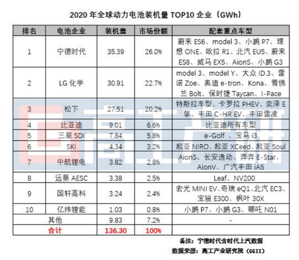 通過 2020 年全球動力電池裝機量 TOP10 排行就能夠看得出來,寧德時代、LG 化學以及松下這三家動力電池供應商分別以 35.39GWh、30.91GWh、27.51GWh 的裝機量占據了全球 68.9% 的動力電池市場份額。