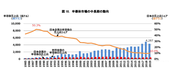 增長戰略草案首先提到,日本半導體產業較之前有所衰落。日本增長戰略委員會在草案中寫道,1988 年,日本在全球半導體市場的銷售份額為 50% 左右;2019 年,這一比例已經降到了 10%。
