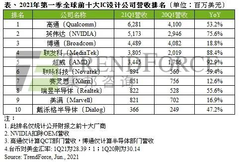 2021年Q1全球前十大IC設計廠商營收排名出爐