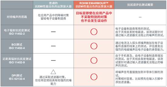 EMARMOUR產品通過了包括“電子輻射抗擾度測試 ISO 11452-2”、“BCI測試 ISO 11452-4”、“近距離輻射抗擾度測試 ISO 11452-9”、“DPI測試 IEC 62132-4”四項國際通行的抗擾度評估測試。朱莎勤介紹道,普通的抗EMI運算放大器一般僅做“DPI測試”,通過采取濾波器對策,僅在特定頻段具有較強的抗噪能力。而羅姆希望簡化工程師針對EMC的設計,同時也確保產品更加穩定,因此通過了四項測試以實現更好的抗干擾性。