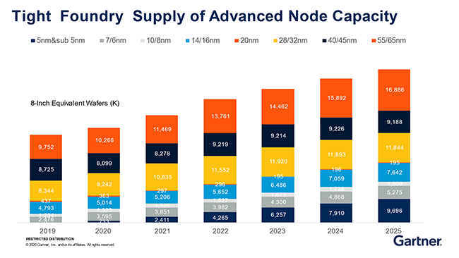 盛陵海認為,半導體“供需緊張”的狀況將會延續到明年第二季度。根據Gartner最新的預測中顯示,5納米及以下工藝產能增幅最大,5納米產能的增加,將會推動先進制成市場的成長。此外,55納米雖然制成較老,但目前需求量非常大,5納米/65納米工藝會有很大的增長空間;而28納米、14納米、16納米市場前景也非常樂觀。