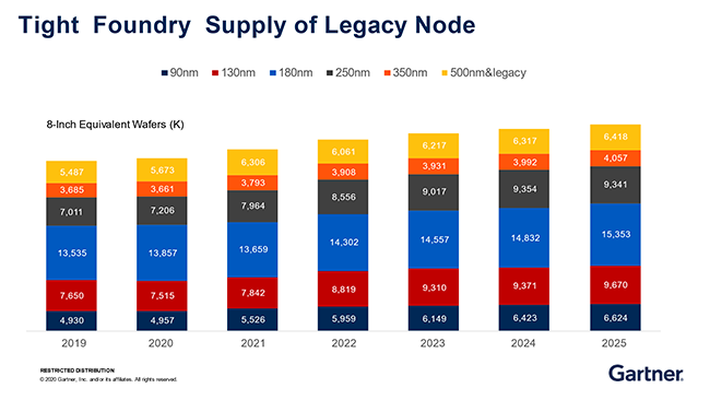 傳統制成大多數集中在8英寸晶圓,如今8英寸晶圓非常緊缺,源于早期8英寸建設高峰時期,過多的產能導致市場出現過剩,市場上長期低價競爭,加之很多企業陸續關閉了8英寸晶圓工廠,而設備廠商陸續全線轉向12英寸,晶圓廠無法提高8英寸產能。此外,5G手機對PMIC、模擬電路需求量激增,大部分為8英寸晶圓,如此以來,需求與產能的供需不平衡,導致8英寸制成緊缺的局面。盛陵海指出,目前8英寸產線沒有新廠的投資,大多數均為擴產,實際是為了滿足增加的迫切需求,但要徹底解決8寸制成緊缺的問題,仍需要將8寸的產能轉向12寸。