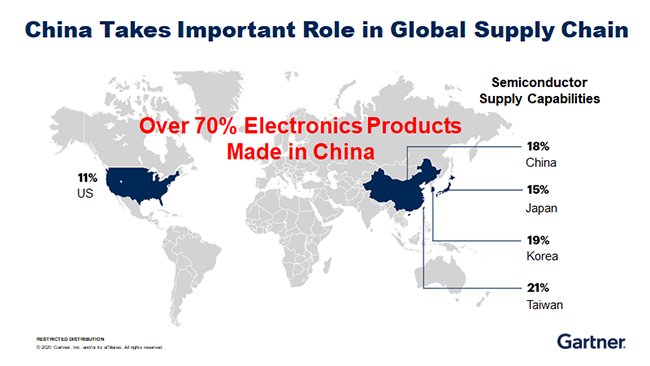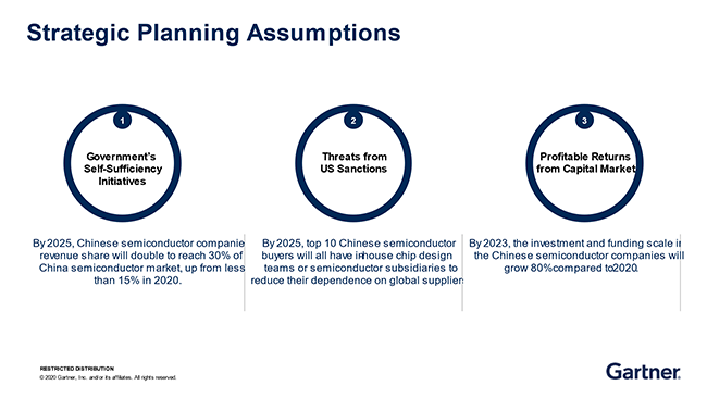 在國內市場方面,中國實際上從五年前就已在半導體自由化方面付諸了行動。根據Gartner的預測,預計在2025年,國內半導體公司市場份額,有望從15%突破到30%。如今的“缺芯”潮對于國內半導體公司而言,創造了千載難逢的機會。