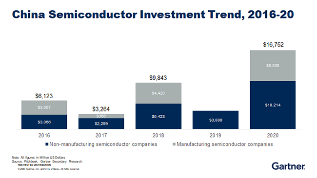 根據Gartner公開的資料顯示,中國半導體企業以及相關企業獲得投資規模主要來源于非生產型的半導體公司和生產型的半導體公司。近兩年間,“非生產型的半導體公司”融資已有非常大的提升,如GPU公司。此外,自動駕駛和“寬禁帶半導體”的投資規模也逐步增加,像華為、小米以及英特爾、高通、三星等海外企業在中國國內積極投資。對于生產型企業,規模和數量都有所增加。此外,科創板的出現帶動了整個投資熱潮,讓很多的投資逐漸集中于半導體產業,如高瓴資本、紅杉資本等開始涉足半導體企業,幫助了新興公司能盡快地進行產品創新或是利用最先進制成打造產品。