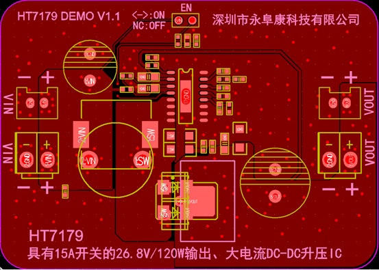 深圳市永阜康科技有限公司針對大功率的DC-DC升壓應用需求,推廣一款集成15A開關管的26.8V、120W輸出、大電流非同步DC-DC升壓IC-HT7179。HT7179采用獨到的電路研發技術以及先進的半導體工藝,重載時高達93%以上的工作效率,無需外加散熱器,升壓到26.8V,可穩定輸出120W。