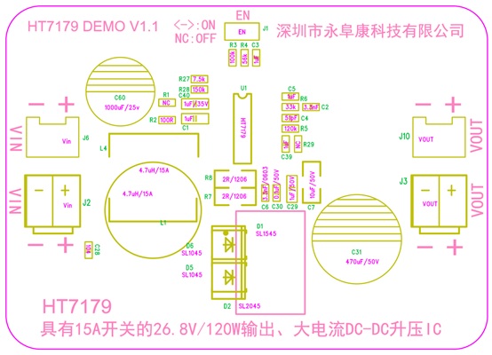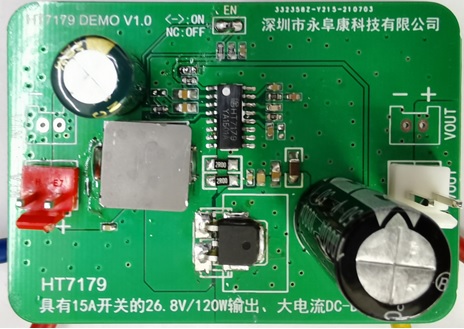 HT7179輸入電壓最低到2.7V,升壓輸出最高到26.8V。開關頻率固定350kHz,峰值電流可通過外圍電阻編程最大15A。支持低EMI工作模式,方便靈活。采用eSOP-16封裝,加上完善的輸出過壓,過熱保護,指標以及可靠性非常出色。HT7179是替代26V/100W左右