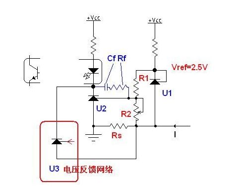 TL431價格低廉,在開關電源的反饋環路大量應用,但其FB電壓為2.5V,直接用做電流反饋時要很大的采樣電阻,浪費電壓。 圖中用兩個TL431實現電流反饋,可以用比較小的采樣電阻,實現精密的電流反饋,如果還有電壓反饋網絡,再并上U3的電壓反饋電路。
