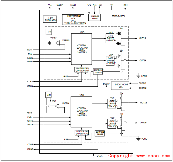 The MAX22203 is a dual 65V, 3.8AMAX H-Bridge withPWM inputs and accurate Current Drive Regulation(CDR). Each H-Bridge can be controlled individually andhas a very low typical RON (high-side + low-side) of 0.3Ω,resulting in high driving efficiency and low heat generation.