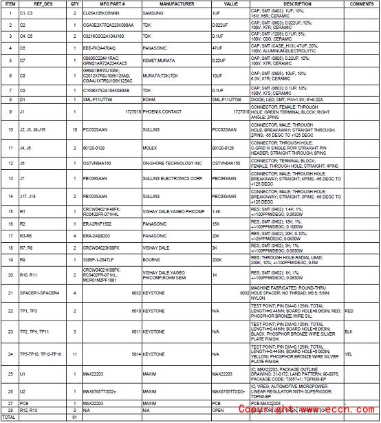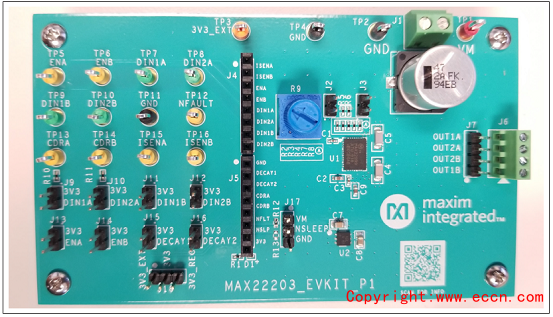 Maxim公司的MAX22203是集成電流檢測的65V 3.8A兩路有刷馬達和單個步進馬達驅動器,具有PWM輸入和精確的電流驅動調節(CDR).每個H橋可單獨地控制,有非常低的RON(高邊+低邊)0.3Ω(TA = 25C),導致了高驅動效率和產生低熱量.MAX22203可用來驅動兩個有刷DC馬達或單個步進馬達.器件具有過流保護(OCP),熱關斷(TSD)和欠壓鎖住(UVLO).開路漏極作用低nFAULT引腳,每次起作用時用作故障條件檢測.在熱關斷和欠壓鎖住時,驅動器處與三態直到正常工作條件恢復.兩個H橋具有65V最大工作電壓.器件采用TQFN38 5mm x 7mm封裝.主要用在有刷DC馬達驅動,步進馬達驅動,螺線管驅動器以及鎖緊閥.本文介紹了MAX22203主要優勢和特性,簡化框圖和應用框圖以及評估板MAX22203 EVK主要特性,電路圖,材料清單和PCB設計圖.