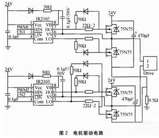 Q1、Q4和Q2、Q3分別組成兩個橋路,分別控制電機的正轉和反轉。高端驅動的MOS管導通時源極電壓和漏極電壓相同且都等于供電電樂VCC,所以要實現MOS管正常的驅動,柵極電壓要比VCC大,這就需要專門的升壓芯片IR2103。控制器產生的PWM信號輸入HIN引腳,控制器I/O口輸出的 EN1、EN2作為使能信號。輸出端HO就可得到比VCC要高的電壓,且高出的電壓值正好是充在電容兩端的電壓。二極管提高導通速度,使得75N75的導通電阻更小,降低了開關管的損失。同時IR2103的兩個輸出口HO、LO具有互鎖功能,防止由于軟件或硬件錯誤造成的電機上下橋臂直通造成短路。