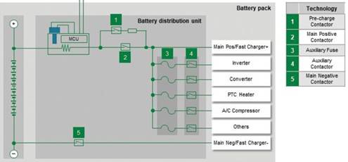 典型的 EV 能量存儲系統(tǒng)由電池組、大功率電流中斷元件、電池控制電路和將電池狀態(tài)傳輸?shù)街鬈囕v處理器的通信電路組成。