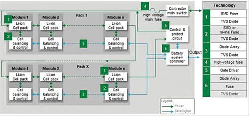 我們已經(jīng)討論了具有高額定電壓的主保險(xiǎn)絲模塊的輸出。每個(gè)單獨(dú)的電池包也應(yīng)該融合。低壓熔斷器可用于此目的。每個(gè)模塊都有自己的微處理器來監(jiān)控電池狀態(tài)并將其報(bào)告給主控制器。因此,有線接口應(yīng)使用 TVS 二極管陣列來保護(hù) CAN 總線。