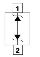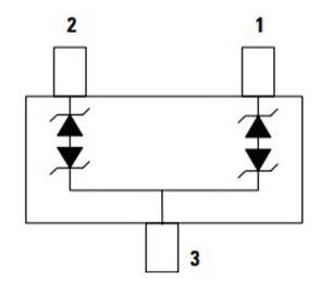 雙向保護(hù) ESD 二極管的示例示意圖,由兩個(gè)陽極到陽極連接的 TVS 二極管組成。 (參考:AQxxC-01FTG TVS 二極管陣列)