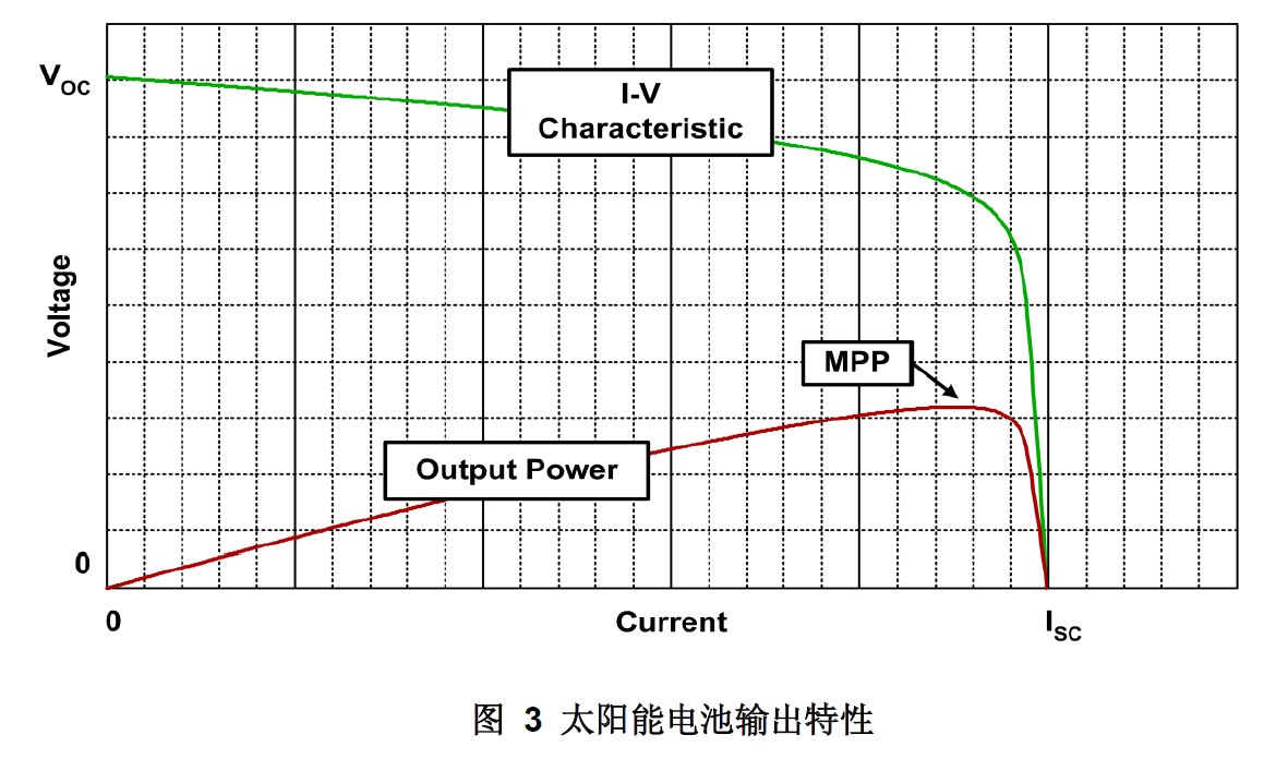 在大多數(shù)應(yīng)用中,人們都期望太陽能電池能提供盡可能多的電能。由于輸出功率是輸出電壓和電流的乘積,因此就必須確定電池工作區(qū)域中的哪一部分所產(chǎn)生的VI值最大。這一點被稱為最大功率點(MPP)。當(dāng)輸出電壓為其最大數(shù)值(VOC)時,輸出電流為零,這是一個極端情況;而當(dāng)輸出電流達到最大值(ISC),但輸出電壓為零時,則是另一種極端情況。在這兩種情況下VI的乘積均為零,因此,這兩種極端情況肯定都不是MMP點。我們可以很容易證明(或通過實驗進行觀察),在任何應(yīng)用中,MPP一般會出現(xiàn)在太陽能電池輸出特性(請參見圖3)下半部分的某個位置。但問題是太陽能電池MPP的確切位置會因入射光線和環(huán)境溫度不同而變化。所以,設(shè)計旨在動態(tài)地調(diào)節(jié)太陽能電池的輸出電流,以達到太陽能電量生成系統(tǒng)的最大化,以便在實際應(yīng)用中其能夠在MPP點或者其臨近點工作。