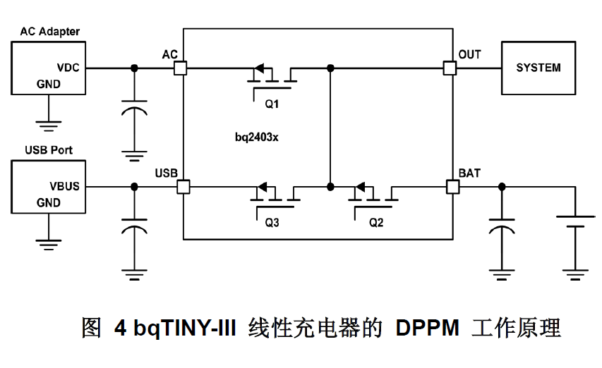 實施這一方案(最大功率點跟蹤器)的方法有很多,但都非常復(fù)雜,尤其是在衛(wèi)星等任務(wù)關(guān)鍵型系統(tǒng)中。然而,在很多小型應(yīng)用中,并不需要極其精確的MPP跟蹤方案,只需要一個能利用率約90%-95%可用電能的簡單低成本解決方案即可。TI線性充電控制器bqTINY-III系列的動態(tài)電源路徑管理(DPPM)功能就可用于諸如簡化MPP跟蹤器的實施。DPPM功能的主要原理如圖4所示。暫時忽略USB輸入,電路的工作原理如下:Q1對OUT引腳的電壓進行調(diào)節(jié),Q2根據(jù)一個典型的CC-CV鋰離子充電曲線對充電電流進行調(diào)節(jié)。如果連接至AC引腳的電源電流不足而無法為系統(tǒng)供電并為電池充電,則VOUT開始下降。如果VOUT達到了預(yù)定義的閾值VDPPM,bqTINY-III則會自動將充電電流降至一個可保持VDPPM時VOUT的水平。