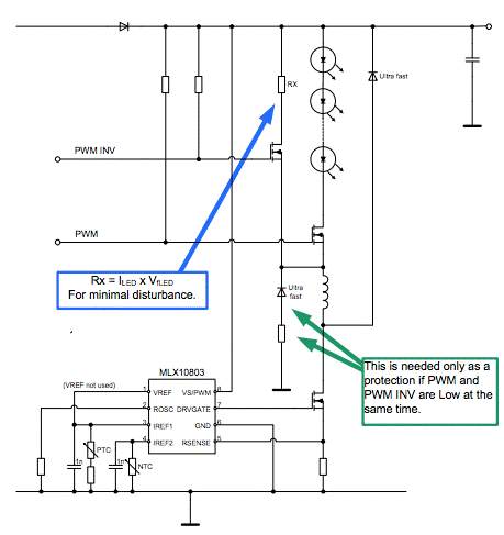創建LED電流的PWM調制的最直接方法是將PWM信號直接施加到MLX10803的電源。MLX10803電路具有非常快的上電時間,如果PWM信號具有以下某些給定的特性,則使用以下電路沒有問題。