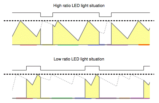 下面是示例中使用的LED調節曲線形式。選擇較大的紋波可以更好地顯示可能發生的非線性。如果要最大程度地減小這種影響,請選擇盡可能小的紋波和關閉(暗)時間內的功耗,該功耗應盡可能接近LED的功耗。