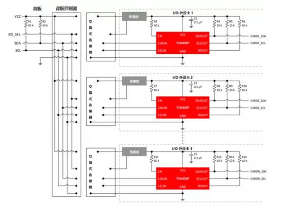 以TI的TCA4307為例——TCA4307 熱插拔 I2C 總線緩沖器支持將 I/O 卡插入帶電背板,而不會損壞數(shù)據(jù)和時鐘總線,適用于背板連接。TCA4307在 I/O 外設(shè)卡上,當(dāng)發(fā)生熱插入事件時可將卡上的 I2C 設(shè)備安全地連接到背板。建立連接后,該器件將提供雙向緩沖,從而使背板和卡的電容保持分離。