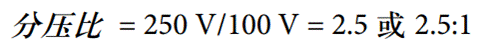 對于下例,考慮運算放大器標稱電源電壓為±100 V。對于需要±250 V 擺幅范圍的應用,通過下式計算分壓比: