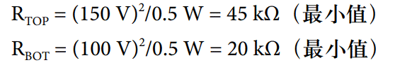 在該示例中,RTOP達到 150 V,RBOT達到 100 V。使用額定功率為 1 /2瓦的 2512 電阻,設計必須將每個電阻器的功耗(V2/R) 限制在 0.5 W 以下。計算每個電阻的  小值,如下所示: