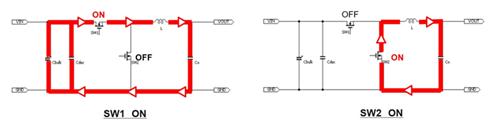 SW1為高邊開關,SW2為低邊開關。SW1導通(SW2為OFF)時,電流路徑是從輸入電容器到SW1、再經由電感L到輸出電容器。SW2導通(SW1為OFF)時,電流路徑是從SW2經由L再到輸出電容器。下圖表示這些電流路徑的差分,每當開關ON/OFF時,紅色線路的電流都會急劇變化。該環路的電流變化非常劇烈,所以會因PCB板布線電感而在環路內會產生高頻振鈴。