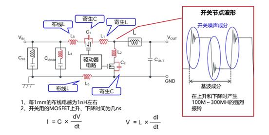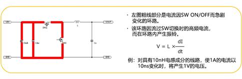 在開關時會產生急劇電流ON/OFF的環路中,會因寄生分量產生高頻振鈴=開關噪聲。