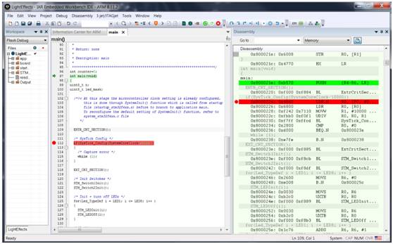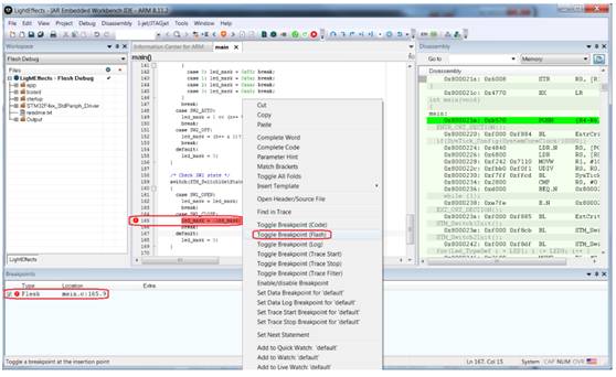 默認情況下,IDE會設置代碼斷點。如果開發人員有一個I-jet仿真器,就可以在右鍵點擊代碼行時明確地選擇一個flash斷點。如果開發人員已經用完了現有全部硬件斷點,這招會很有用。注意斷點符號中的“F”說明改斷點是Flash斷點。IAR Embedded Workbench for Arm的7.60或更高版本中提供flash斷點功能。