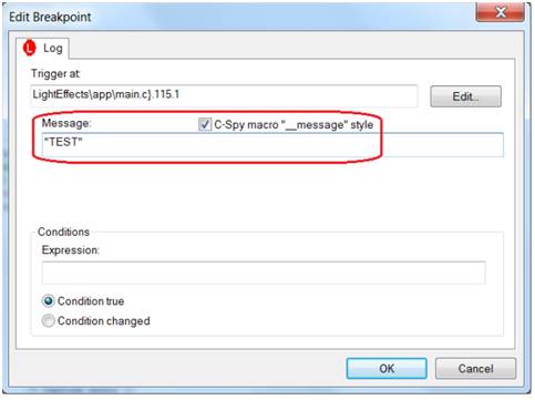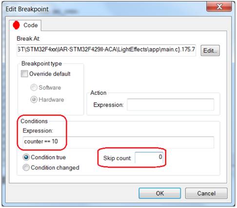 當需要在一個中斷例程內設置斷點時,這非常有用。如果沒有條件,就不可能調試應用,因為程序將一直停止。使用標志或變量作為條件可以簡化操作。此外,還可以進一步使用跳過計數器和條件檢查,如true或changed。