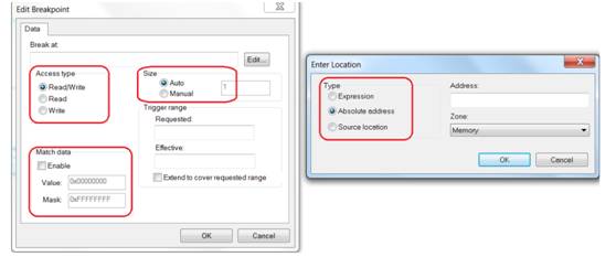 相比其他斷點,數據斷點有些不同,因為它們監測對特定內存地址、標志、變量或寄存器的讀寫訪問。數據斷點使用非常直截了當只需右鍵點擊標志或變量,然后選擇選項Set data Breakpoint即可。默認情況下,讀和寫的訪問將被監測。如果開發人員想增加額外的設置,可以通過View->Breakpoints window和Edit option來完成。除了訪問之外,還可以監測數據是否匹配。這意味著只有當數據匹配時,寫或讀的訪問才會觸發停止。選擇“Edit”按鈕,可以打開一個額外的窗口,可以選擇絕對地址甚至是源代碼行。如果是一個變量或標志,建議使用自動大小。如果需要監測更大的范圍,應手動設置所需的大小。