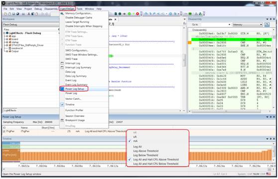 得益于IAR Embedded Workbench的功率調試技術,開發人員可以監控能耗并將其與源代碼聯系起來。這使得了解整個應用的能耗成為可能。這個概念也使得添加功率斷點成為可能。可以設置一個閾值,比如25mA,一旦能耗超過這個值,調試器就會中斷。