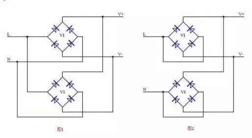 在小功率設計中,一般很少用到整流橋的并聯,但在某些大功率輸出的情況下,不想增添新的器件單個整流橋電流又不滿足輸入功率要求,就需要用到整流橋的并聯了,整流橋的并聯不能采用兩個整流橋各自整流后直流并聯的方式,也就是不能采用圖1的方式,因為整流橋沒有配對,單純靠自身的V-I特性,一般是無法均流的,這樣就會造成兩個整流橋發熱不一致。而采用圖2的方式,通常認為在一個封裝內的兩個二極管是非常匹配的,是可以均分電流的,所以采用圖2的方式就可以實現整流橋的并聯了。