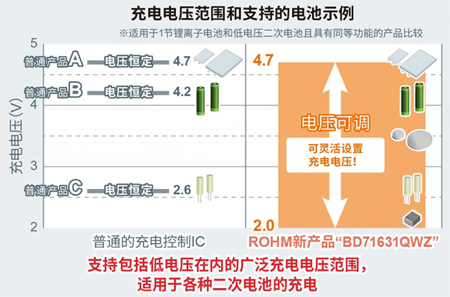 在這種背景下,ROHM開發出一款充電控制IC,不僅支持鋰離子二次電池的充電,還支持全固態和半固態等新型二次電池的低電壓充電。