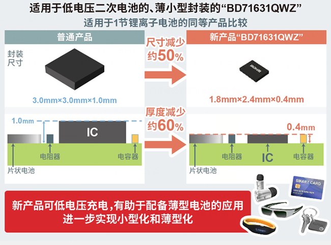 新產品通過提高IC內部的電路穩定性,實現了從2.0V到4.7V的寬充電電壓范圍,不僅支持鋰離子電池等傳統二次電池的充電,還支持需要低電壓充電的新型二次電池*1(如近年來開發的全固態和半固態電池)的充電。普通充電控制IC的充電電壓是固定的,但新產品只需改變外部電阻即可輕松設置充電電壓,這也有助于減少更換電池等工作所需的設計工時。此外,采用ROHM自有的封裝技術,實現了厚度僅為0.4mm的薄型封裝(比普通產品薄60%),有助于應用設備的進一步小型化和薄型化。不僅如此,由于可以設置CCCV*2充電的各項充電特性(充電電流、終止電流等),因此能夠為搭載新型二次電池的可穿戴設備和小而薄的物聯網設備提供理想的充電環境。