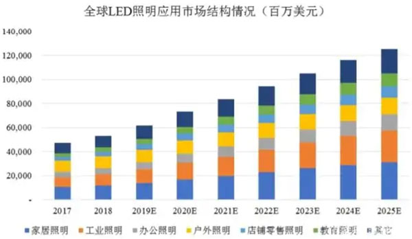 預(yù)計(jì)未來(lái)一段時(shí)間家居照明仍將是LED照明最大的應(yīng)用場(chǎng)景,市場(chǎng)規(guī)模將在2025年達(dá)到312.45億美元,占比接近25%。教育照明則是增速最快的細(xì)分應(yīng)用類別,預(yù)計(jì)市場(chǎng)規(guī)模將由2018年的34.60億美元增加至2025年的108.16億美元,年復(fù)合增速達(dá)到17.68%。
