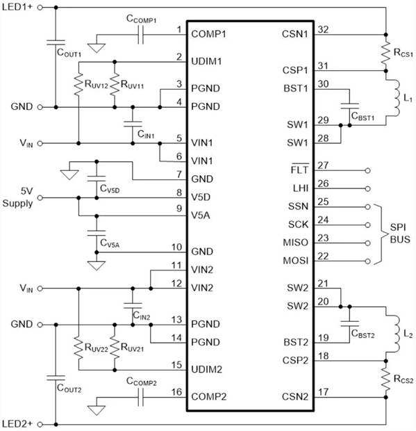 Texas Instruments公司的TPS92520-Q1是一款單片雙路同步降壓LED驅(qū)動(dòng)器,具有4.5V至65V寬工作輸入電壓范圍,可獨(dú)立為兩串串聯(lián)的LED供電。該芯片具有自適應(yīng)導(dǎo)通時(shí)間平均電流模式控制功能,經(jīng)設(shè)計(jì)可與分流FET調(diào)光技術(shù)和基于LED矩陣管理器的動(dòng)態(tài)光束前照燈兼容。