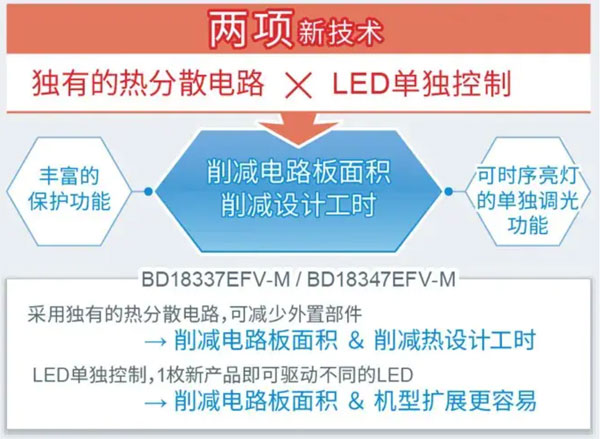 圖5:BD18337EFV-M獨(dú)有的兩項(xiàng)新技術(shù)有助于大幅削減車載LED燈的占板面積和設(shè)計(jì)周期(圖源:ROHM)