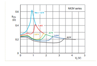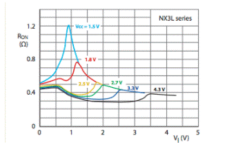 NX3L和NX3V器件的低導(dǎo)通電阻和低Ron平坦度的結(jié)合(請(qǐng)參見下面的曲線)極大地降低了開關(guān)信號(hào)的衰減和失真,從而消除了許多應(yīng)用中對(duì)緩沖放大器的需求。