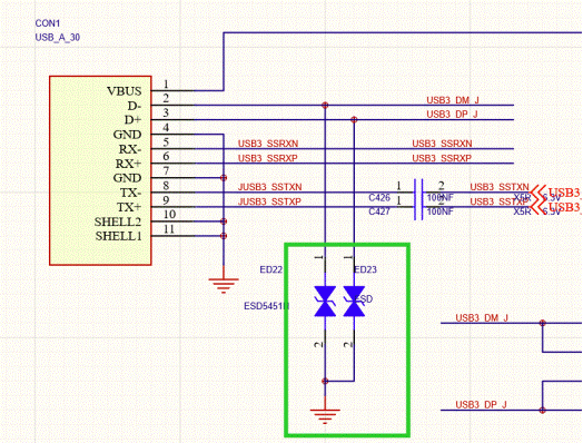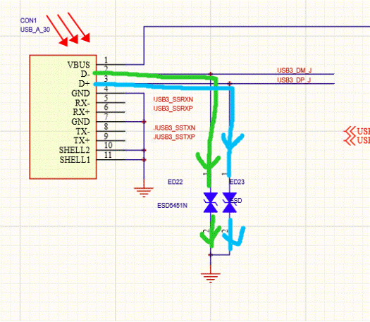 如上圖是我們在電路中最常見的處理靜電的防護電路,給接口器件添加esd進行接地。