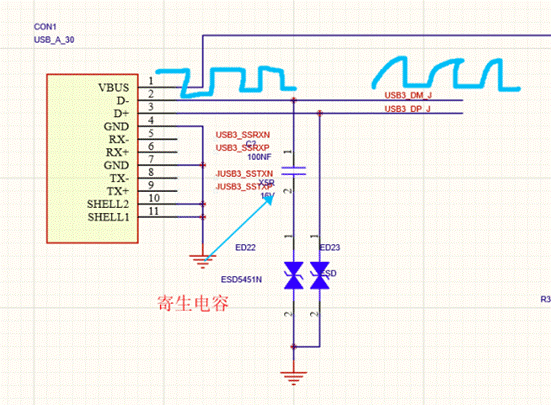 ESD器件是有寄生電容的,如圖是寄生電容對高速電路接口的影響,寄生電容會影響電平的上升和下降速度,影響輸出后的信號。