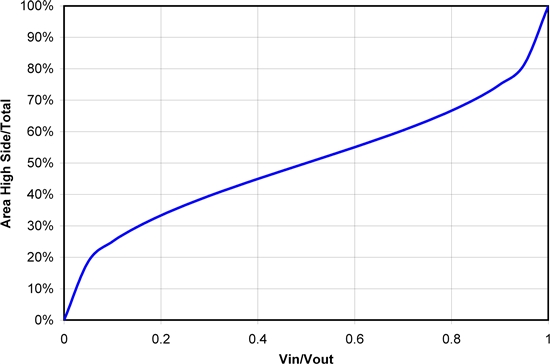 通過圖 1,我們知道 50% 轉換比率時出現最佳傳導損耗極值。但是,在其他轉換比率條件下,可以將損耗降至這一水平以下。附錄 1 給出了進行這種優化的數學計算方法,而圖 2 顯示了其計算結果。即使在極低的轉換比率條件下,FET 芯片面積的很大一部分都應該用于高側 FET。高轉換比率時同樣如此;應該有很大一部分面積用于低側。這些結果是對這一問題的初步研究,其并未包括如高側和低側FET之間的各種具體電阻值,開關速度的影響,或者對這種芯片面積進行封裝相關的成本和電阻等諸多方面。但是,它為確定 FET 之間的電阻比提供了一個良好的開端,并且應會在FET選擇方面實現更好的整體折中。
