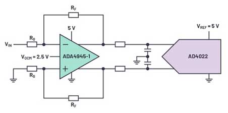 ADA4945-1雙極性差分放大器妥善地權衡了上述這些特性。它具有低直流失調、失調溫漂和出色的動態性能,非常適合多種高分辨率、功能強大的數據采集和信號處理應用,這些應用通常需要使用驅動器來驅動ADC,如圖1所示,由ADA4945-1驅動AD4022 ADC。 ADA4945-1可配置多種功率模式,您可以在特定轉換器上更好地權衡性能與功率。例如,在全功率模式下,可與AD4020配對,降低至低功耗模式后,可以適應AD4021或AD4022的低采樣速率。