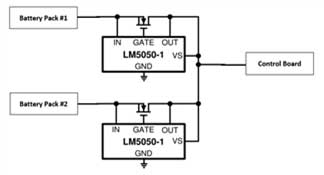 75V,最大承受電壓支持100V。LM5050通過檢測VDS上電壓,控制VGS上電壓,實現理想二極管的功能。同時因為LM5050內部已經集成了電荷泵,供電電壓無需高于電池包電壓。在無繩電動工具中,可以通過多包并聯方式,提升整體的電池容量,也可以實現不同電壓等級電池包并聯。如圖3所示,通過電池包輸出串聯MOS的源級,經由LM5050的控制,可以實現多個電池包并聯。