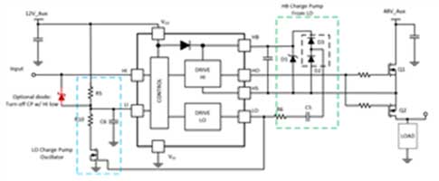 SLUAA58)。如圖6所示,通過半橋驅動芯片,例如UCC27284,構建電荷泵,把電荷泵電容電壓提升12V。通過上橋臂的邏輯電平,可以控制功率回路的通斷。同時,一般的半橋驅動IC的工作電流較大,工作電流達mA級別;失能條件下,靜態電流為7uA。從驅動能力上看,整體上取決于電荷泵電容和驅動電阻,在供電電壓12V,驅動電阻8.25Ω,電荷泵電容470nF等條件下,驅動電流為1.68A,開通關斷時間小于0.5us。